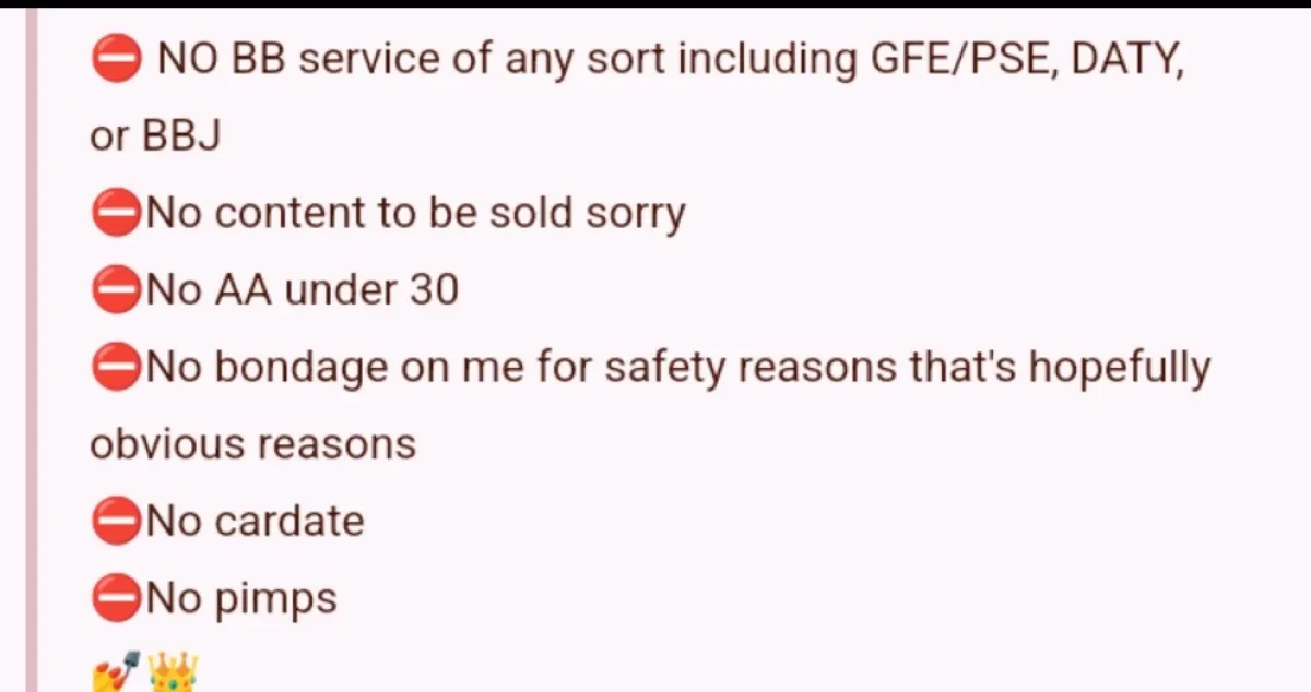 NON NEGOTIABLE Donations; Im professional Escort not a π¦ after receiving my list and you try to counter bargain get you blocked... not up for debate β